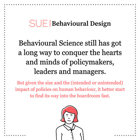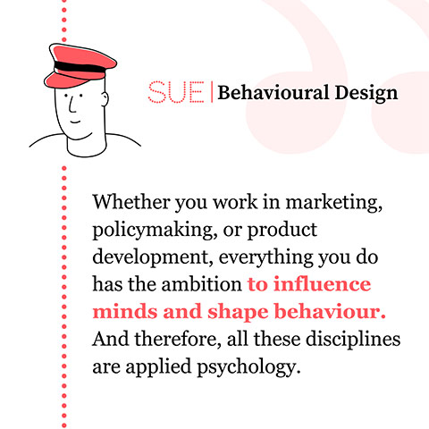 You can also hire SUE to help you to bring an innovative perspective on your product, service, policy or marketing. In a Behavioural Design Sprint, we help you shape choice and desired behaviours using a mix of behavioural psychology and creativity.
